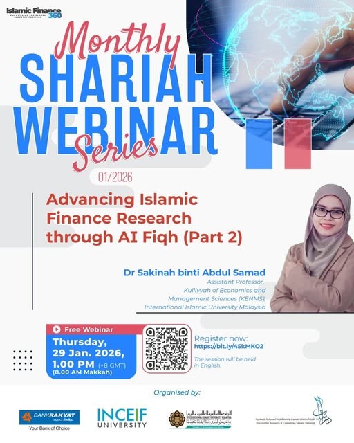 The Monthly Shariah Webinar is back with the 1st Series of 2026, proudly brought to you by Bank Rakyat, INCEIF University, International Islamic University Malaysia (IIUM) and Derasat for Research & Consulting Islamic Banking (DRCIB).